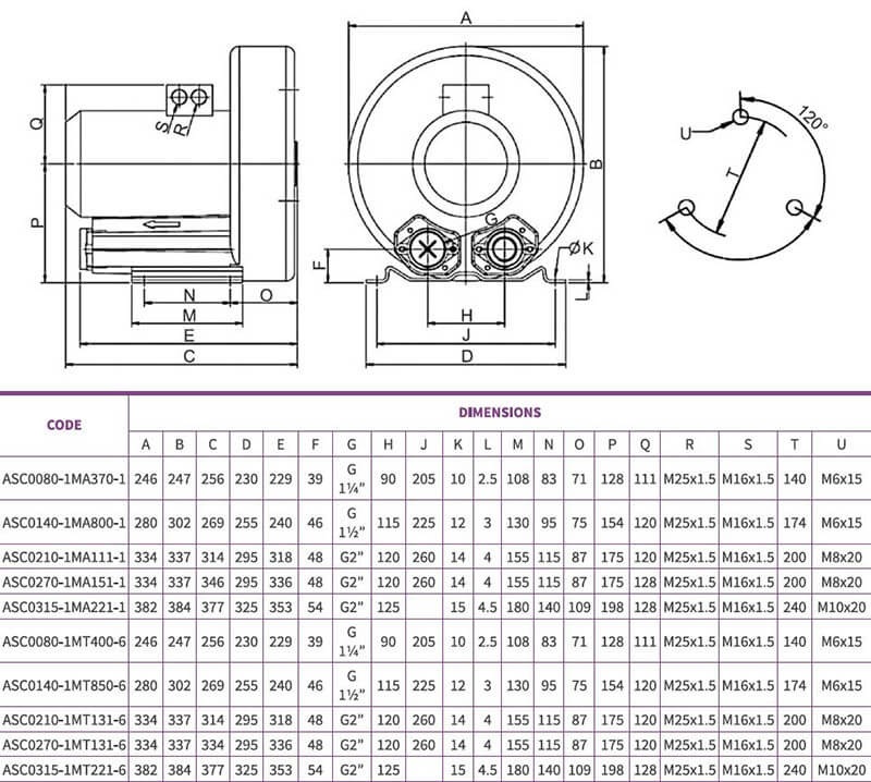 Brand: Atecpool,Flow rate, m3/h: 376,Power consumption, kW: 3,Phase: Single/ Three Category: Airtech ASC0210 1.1 kw 210 m3/h 230 V air blower
