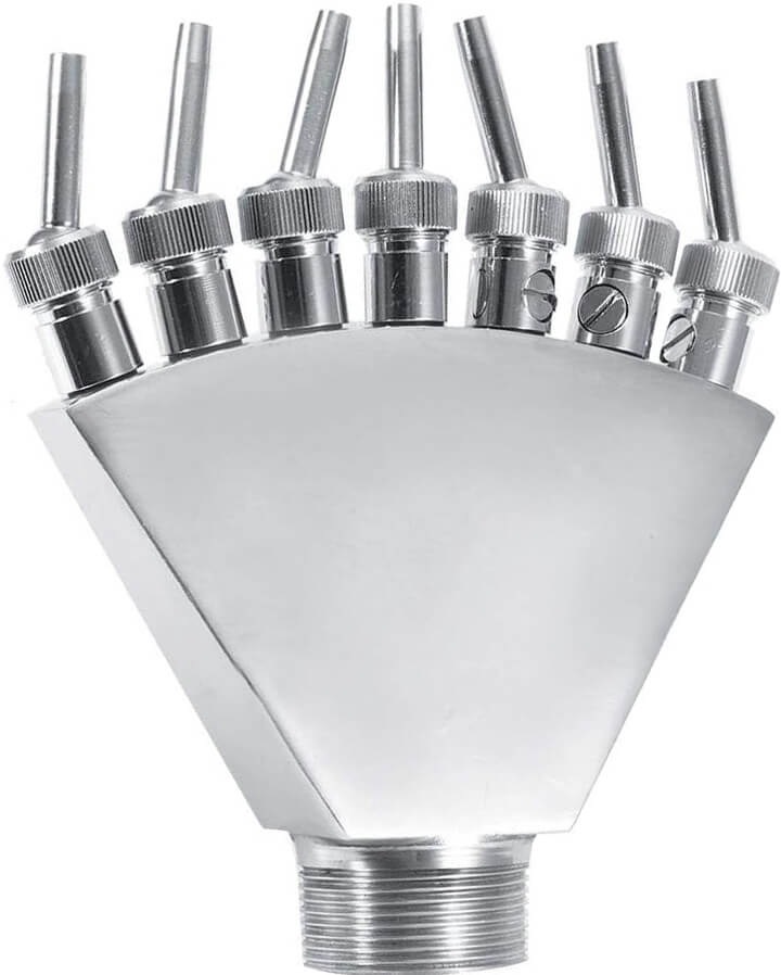 The fountain nozzle is the device that is responsible for the shape of the water pattern along with the water pump. In order for the fountain to work properly, you need to choose a suitable pump, based on the hydraulic resistance. The nozzle is made of a material that does not corrode.