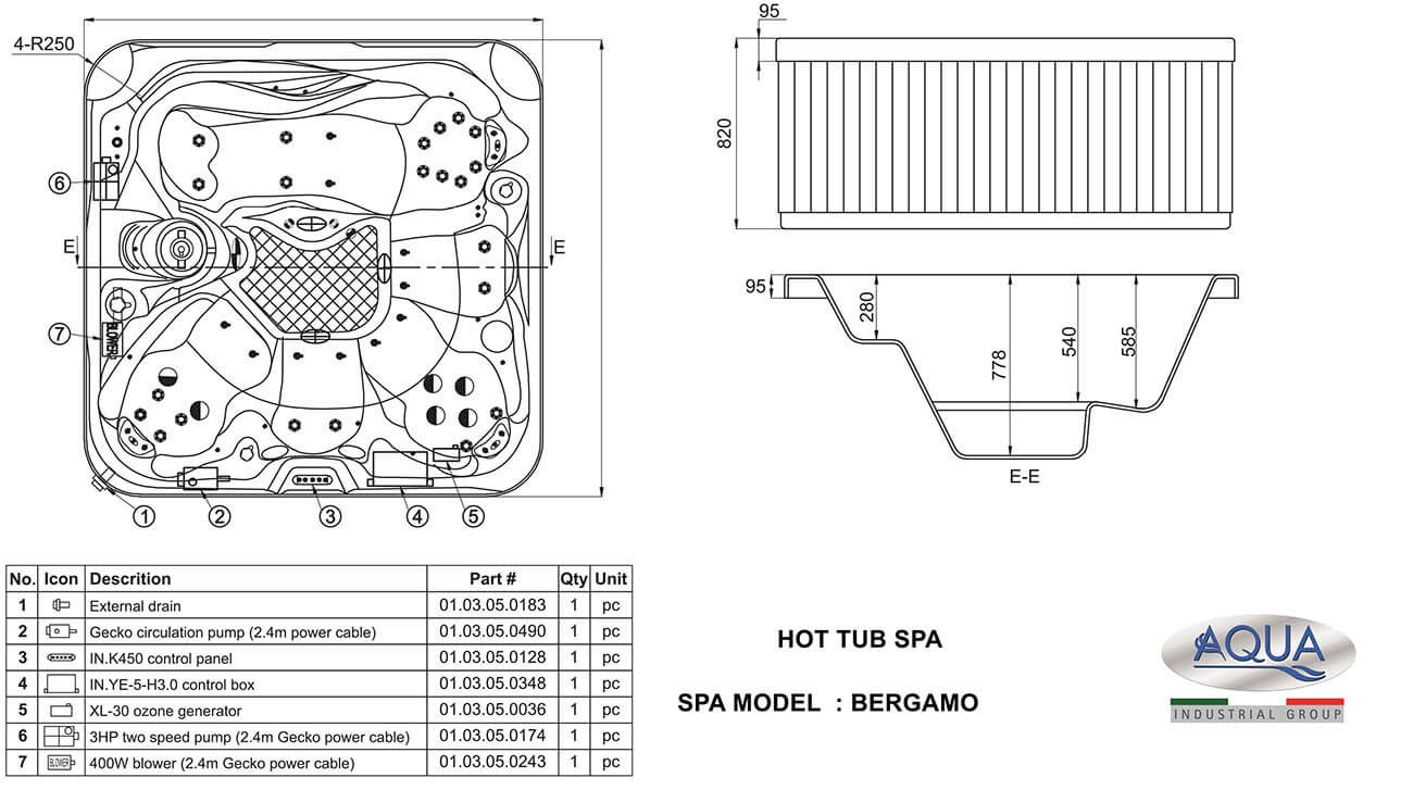 Brand: Atecpool,Number of Jets: 87,Type: SPA tub Category: Aqua Industrial Bergamo SPA tub 2000 x 2000 x 820 mm, 5 places