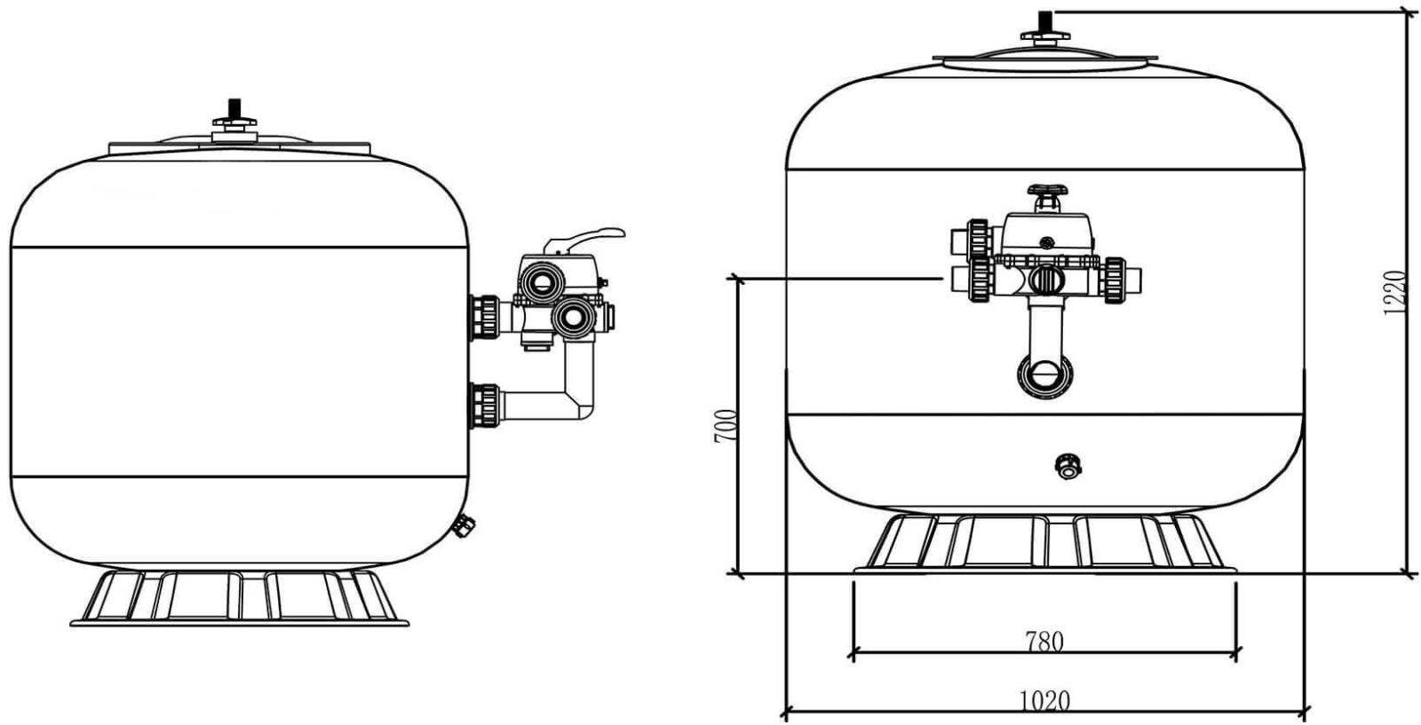 The "Munich" series of bobbin-wound sand filter is made of polyester resin and fiber. For diameters up to 900 mm, it has a cover with a screw closing. For dimensions 1100 and 1200, it has a 400 polyester/fiberglass cover. The multiport vales are available in six positions: filter, backwash, rinse, recirculate, waste and closed.