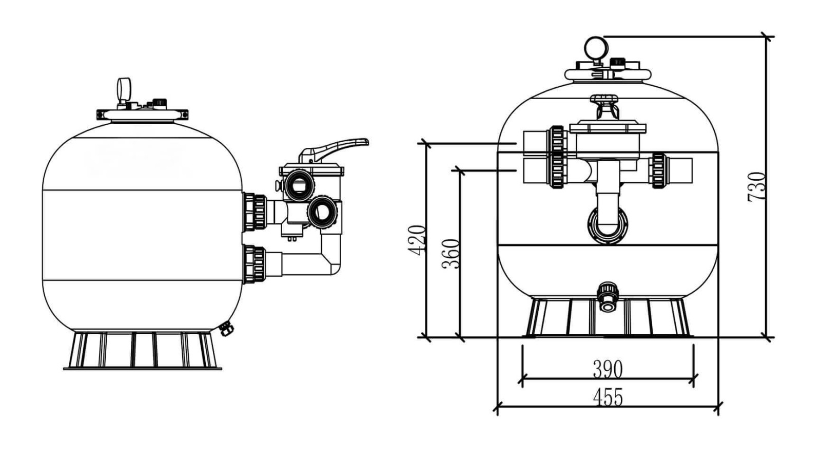 The "Munich" series of bobbin-wound sand filter is made of polyester resin and fiber. For diameters up to 900 mm, it has a cover with a screw closing. For dimensions 1100 and 1200, it has a 400 polyester/fiberglass cover. The multiport vales are available in six positions: filter, backwash, rinse, recirculate, waste and closed.