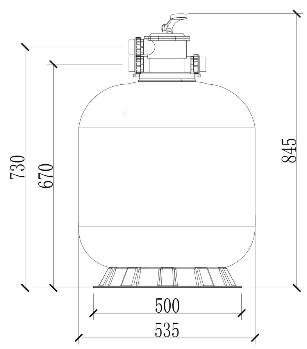 The "Munich" series of bobbin-wound sand filter is made of polyester resin and fiber. For diameters up to 900 mm, it has a cover with a screw closing. For dimensions 1100 and 1200, it has a 400 polyester/fiberglass cover. The multiport vales are available in six positions: filter, backwash, rinse, recirculate, waste and closed.