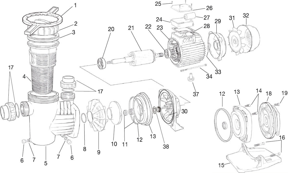 • Polypropylene pump shell, cover and diffuser, chemical-proof in swimming pools and reinforced with glass cloth.
