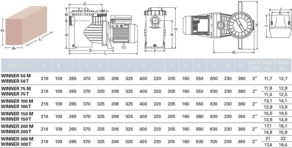 Brand: Hayward,Voltage, V: 230,Power consumption, kW: 9.5,Flow rate, m3/h: 16.5 Category: Aqua Industrial WINNER-75M 15.7 m3/h pump for the swimming pool, 0.75 HP