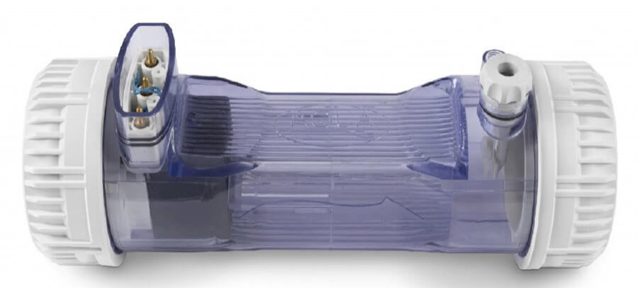 Chlorine sanitizer is created in the electrolyte cell through an electrolyte reaction, which provides sodium hypochlorite from an aqueous solution of sodium chloride. It includes the flow sensor, the titanium sheets and a PT100 transducer for measuring temperatures.