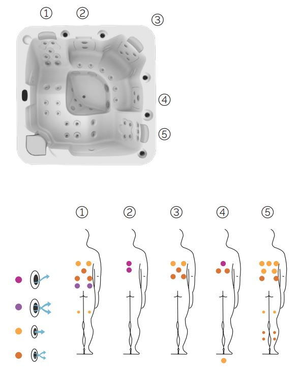 • Five fully equipped positions, including two loungers and three deep seats with headrests. These positions are designed to provide the best massages possible, allowing you to fully relax and unwind. Whether you want to enjoy a solo soak or share the experience with friends and family, the Feel has something for everyone.