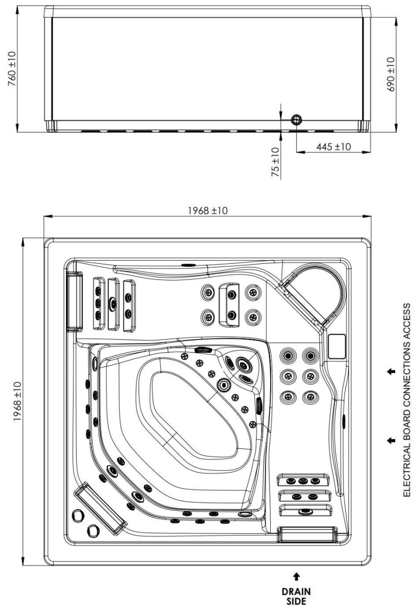 Brand: AstralPool,Voltage, V: 690,Power consumption, kW: 9.2,Flow rate, m3/h: 155 Category: Aquavia Exclusive Line Lounge City SPA tub 198 x 198 x 76, 5 places