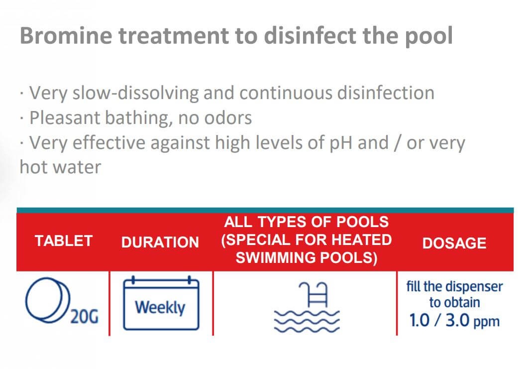 Dosage - The suggested levels of residual bromine for private pools should be maintained between 1-3 ppm, while private SPAs should aim for levels between 2-4 ppm.