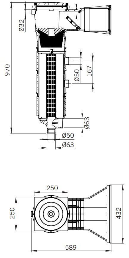 The skimmer is designed with multiple connections to accommodate different types of pool configurations. The upper access water connection is Ø 32 mm, while the bottom connections are Ø 63 mm, and the lateral connections are Ø 50 mm. These lateral connections are specifically designed for connecting suction nozzles, making it easy to keep your pool clean and free from debris.