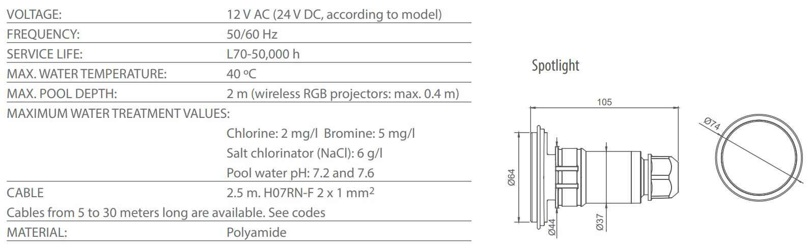 • For stainless steel or dark-colored pools, it is recommended to oversize the projectors per m².