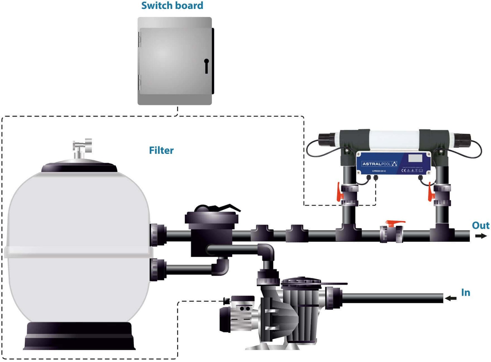 To apply Lyriox UV-C treatment to your pool, it's necessary to have a UV-C system integrated into your pool's filtration system. The water is circulated through the UV-C system, where it undergoes exposure to UV-C light, before being returned to the pool. The duration of the treatment is determined by the pool size and water flow rate.