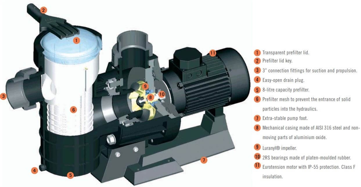 The motorized pump features a durable plastic body and supports, as well as a robust AISI-316 stainless steel motor shaft with double insulation for added safety. With an IP-55 protection rating, the motor is shielded against dust and water ingress, ensuring reliable operation. The prefilter basket boasts a generous 8-liter capacity and is conveniently equipped with a transparent lid, allowing for easy monitoring of its contents.