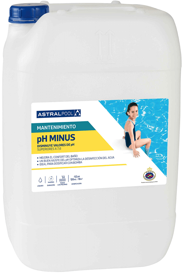 Since the weather and the environment causes fluctuation in the pH level of the pool water It is advised to check the pH level of the water on daily basis. The Astral Pool liquid pH minus is ideal for pump dosing. An imbalance of the pH can cause discomfort to the skin and eyes of the pool users; hence it is essential for optimum treatment of the water.
