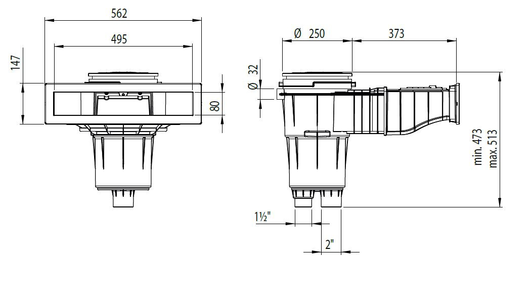 2" side outlet and 1.5" bottom outlet