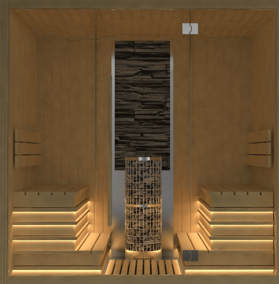 The Miramonte sauna is an excellent example of a Finnish sauna and is constructed with flooring made of abachi wood and premium white pinewood vertical panels. The Miramonte sauna's complete front panel is made of glass to show off the interior LED lighting. Contains two benches with Abachi headrests as well as a heater customized for each measurement.