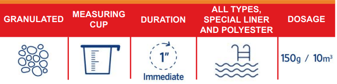 Maintenance Treatment: daily use of 1-3 g of the granules per m3 of water