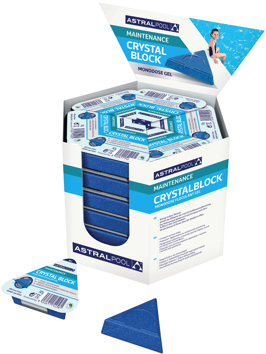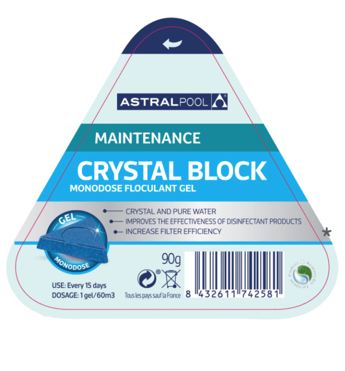 AstralPool CrystalBlock gel flocculant for pools is a highly effective and natural solution to cloudiness and dirty pool water. The liquid is specially designed to promote clarity and purity in pool water, without the use of harsh chemicals that can be harmful to swimmers and the environment. The formula of the CrystalBlock gel flocculant is made up of highly concentrated natural polymers that work to clump together and sink suspended particles, such as dirt and debris, to the bottom of the pool. With the use of a pool vacuum or skimmer, bigger particles produced by the flocculation process can be quickly removed from the water. All pool types, including saltwater, chlorine, and bromine systems, are safe to use.