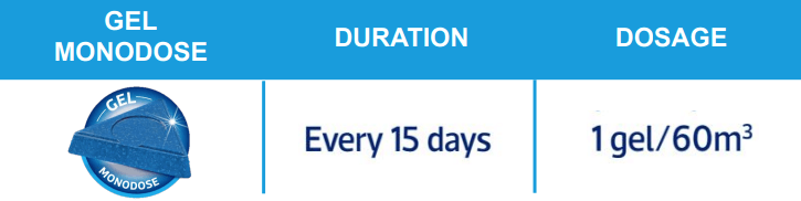 For pools up to 50 to 60 m3, add 1 tablet of the product every two to four weeks.