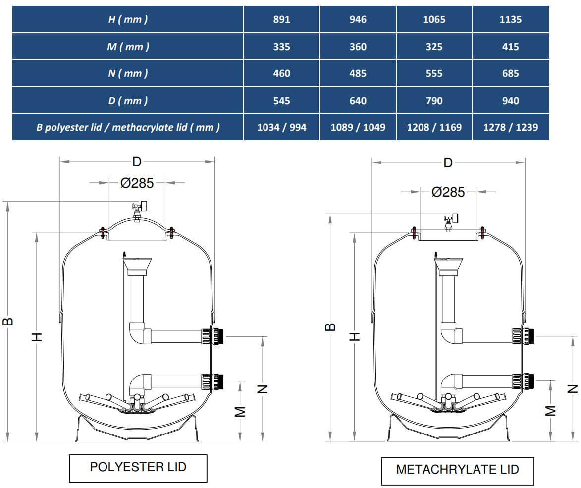 The methacrylate cover with screws ensures that the filter media stays in place, and the diameter of the top access (285 mm) provides easy access for cleaning and maintenance.