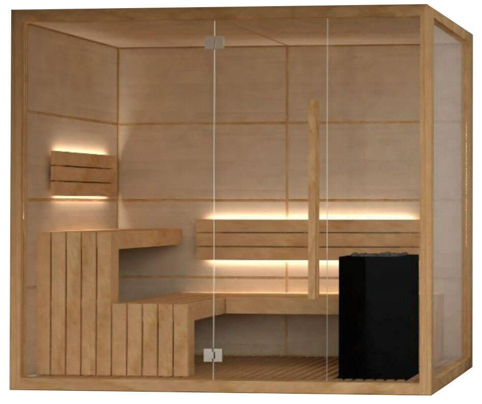 Constructed of high-quality Hemlock plywood panels that are 14 mm thick, the Lobos sauna is both durable and visually stunning. The benches are made of Abachi wood, which is known for its resistance to high humidity and heat, making it the perfect choice for a sauna environment.