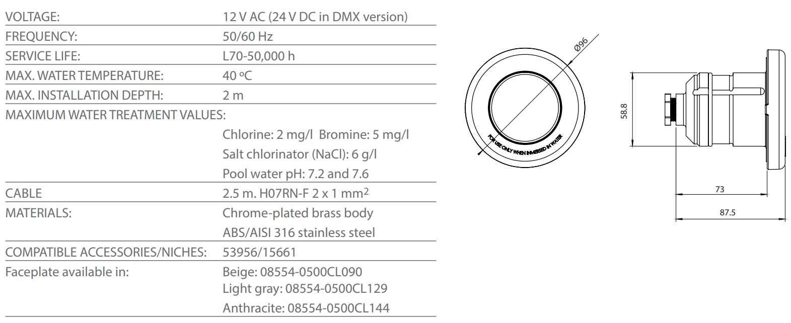 • Compatible with conduit code 15661, the LumiPlus niche code 53956 and 63-mm PN6 piping