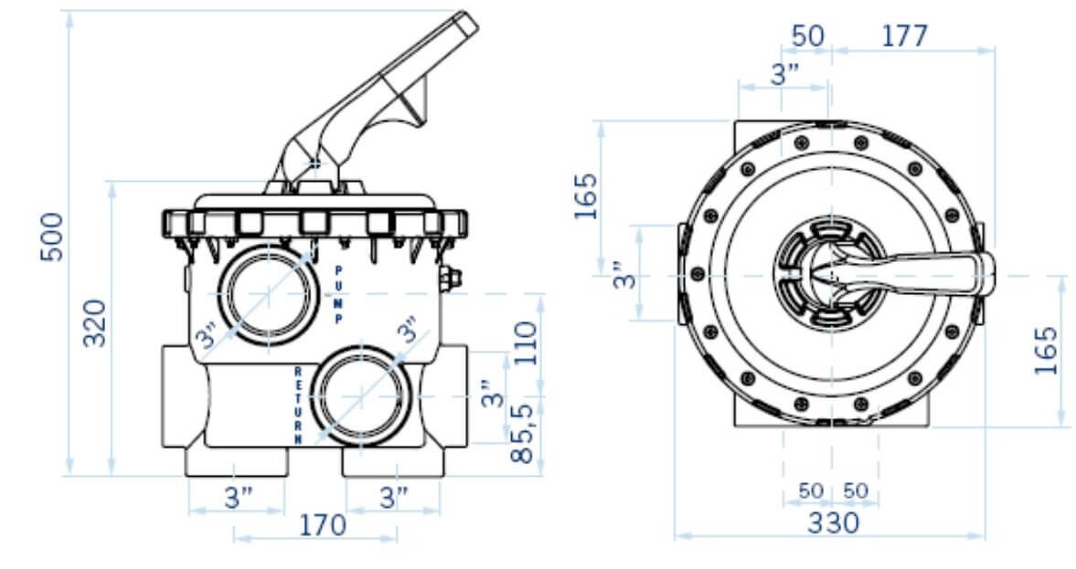 The AstralPool Magnum 3" multiport valve is a side-mounted valve that is designed to connect to filters. The valve features a durable construction, with both the body and cover being injected in ABS with fiberglass. The handle is also injected in ABS, ensuring that it is strong enough to withstand regular use.