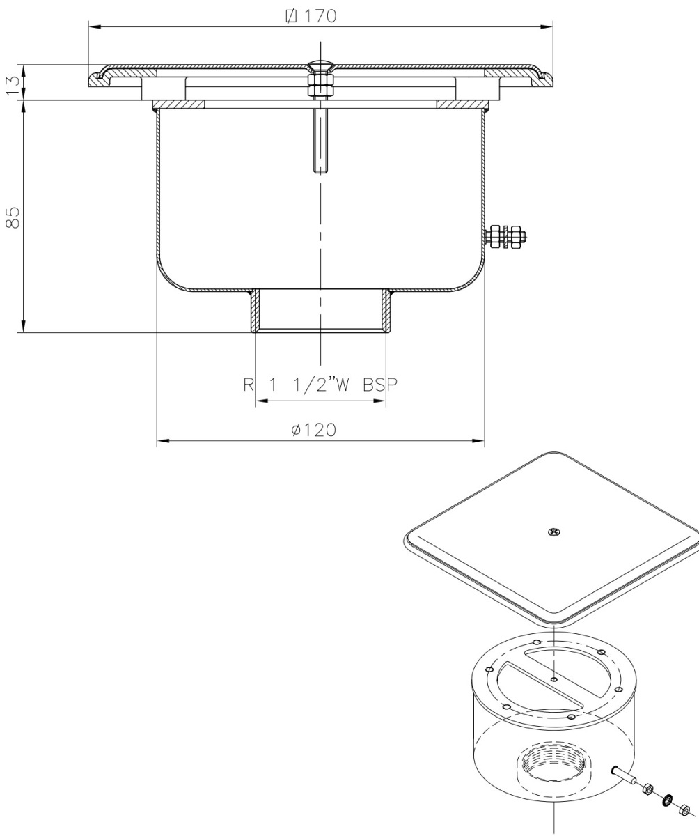 Brand: Pentair,Pool type: concrete Category: AstralPool main drain with square cover for concrete pool, 1 ½ “, AISI – 316L