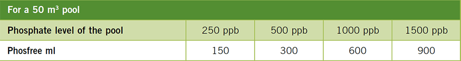Add 60 ml of product per 50 m3 of water once a week to keep phosphate levels below 125 ppb (parts per billion) while the filtration system is operating and swimmers are not using the pool.