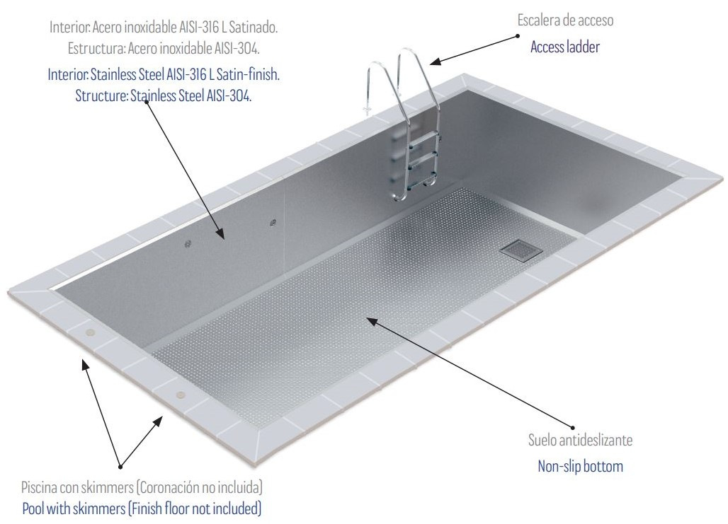 Brand: AstralPool,Pool type: concrete,Material: Stainless steel Category: AstralPool Optimal stainless steel pool with skimmer, 5 x 3 x 1,2 m
