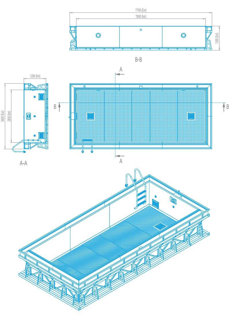 Pool constructed from a single piece of stainless steel that is 2 mm thick. It provides a filtering system equipped with overflow and has strong LED projectors built in and a beautiful grille that is optionally available with a variety of finishes. Ready to connect hydraulic pre-installation is included. It incorporates a countercurrent device that is self-powered, making swimming in the pool more adaptable.