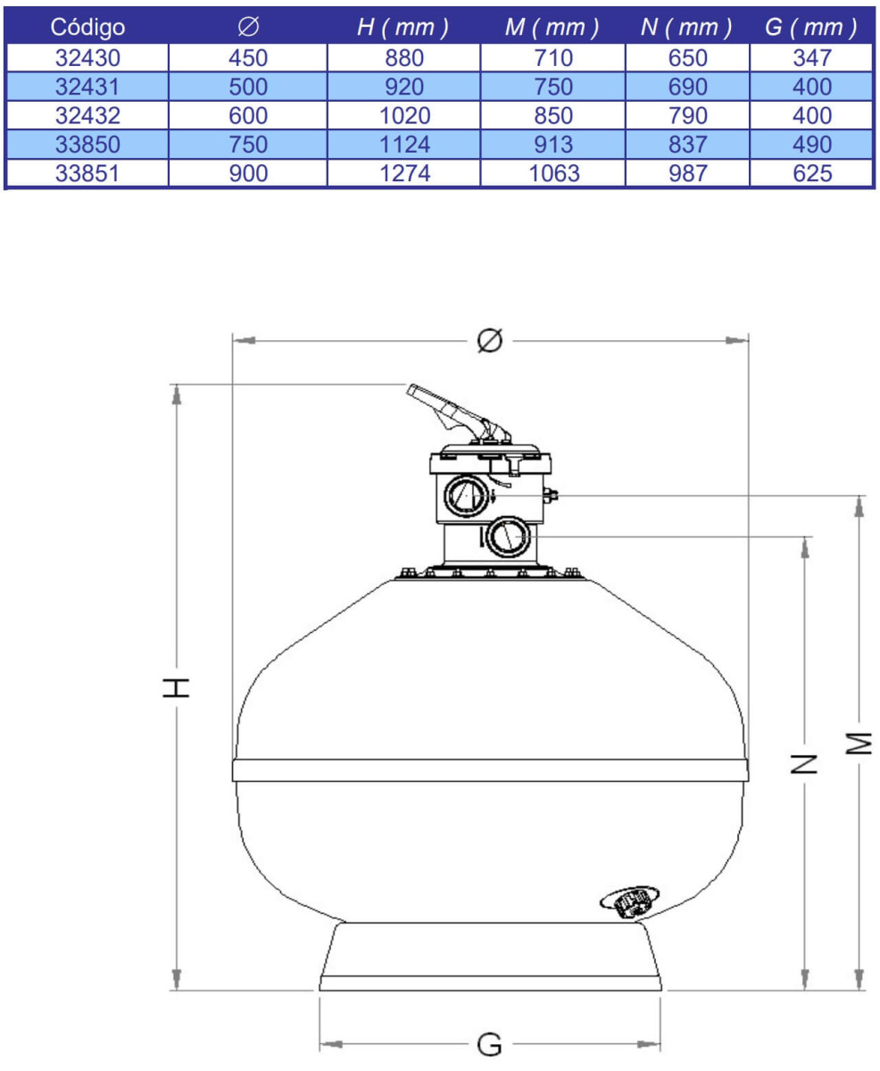 Brand: Hayward,Valve type: top mounted Category: AstralPool Vesubio side mounted laminated filter, Ø 450 mm, 8 m3h