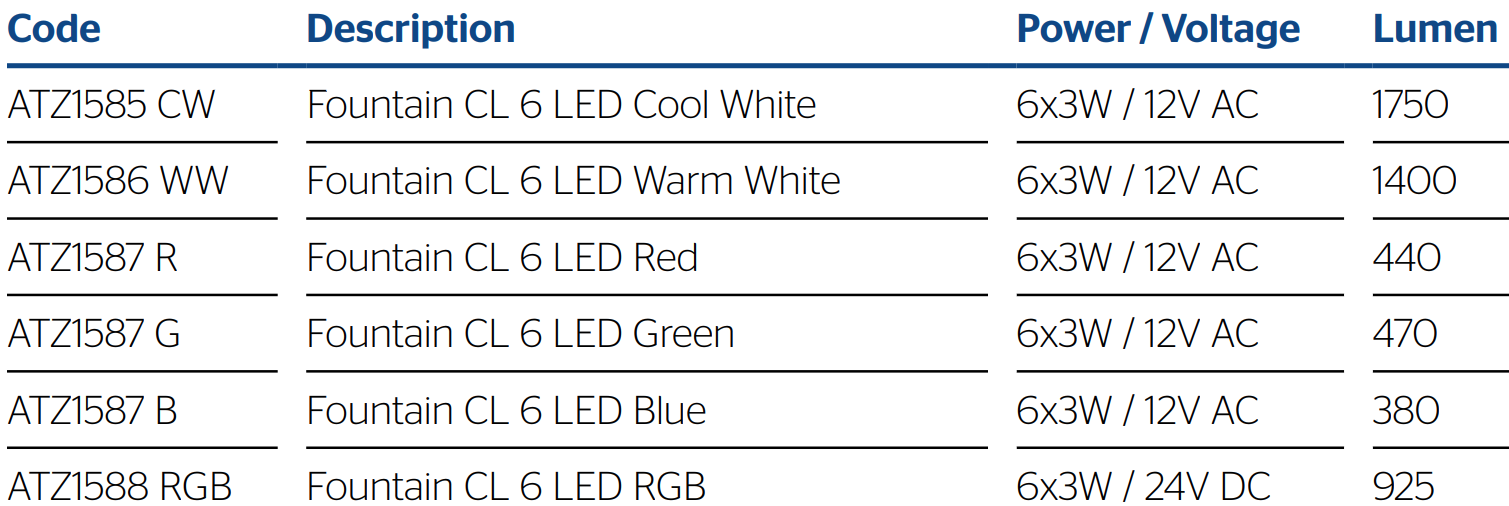Key features and characteristics of the Atecpool CL 6 LED fountain light: