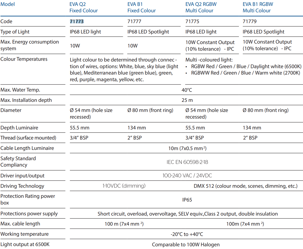 Atecpool EVA B1 RGBW Multi Colour is a state-of-the-art lighting solution designed specifically for swimming pools and SPAs. With its exceptional features and stunning RGBW Multi colour illumination, it brings a new level of beauty and ambiance to aquatic environments.