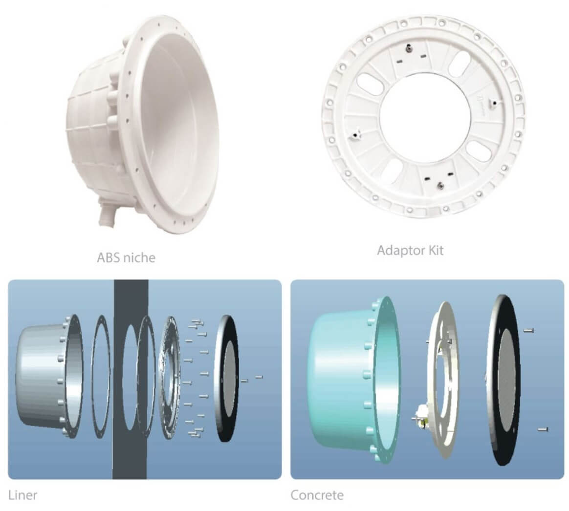 For easy installation, the lights come with a 3-meter 2 Core 2x1.0 mm2 cable, providing convenient connectivity options for all models. Additionally, the ABS frame of the lights is compatible with any size niches, thanks to the installation adaptor kit included with the lights. This ensures a hassle-free installation process, regardless of your pool's specifications.