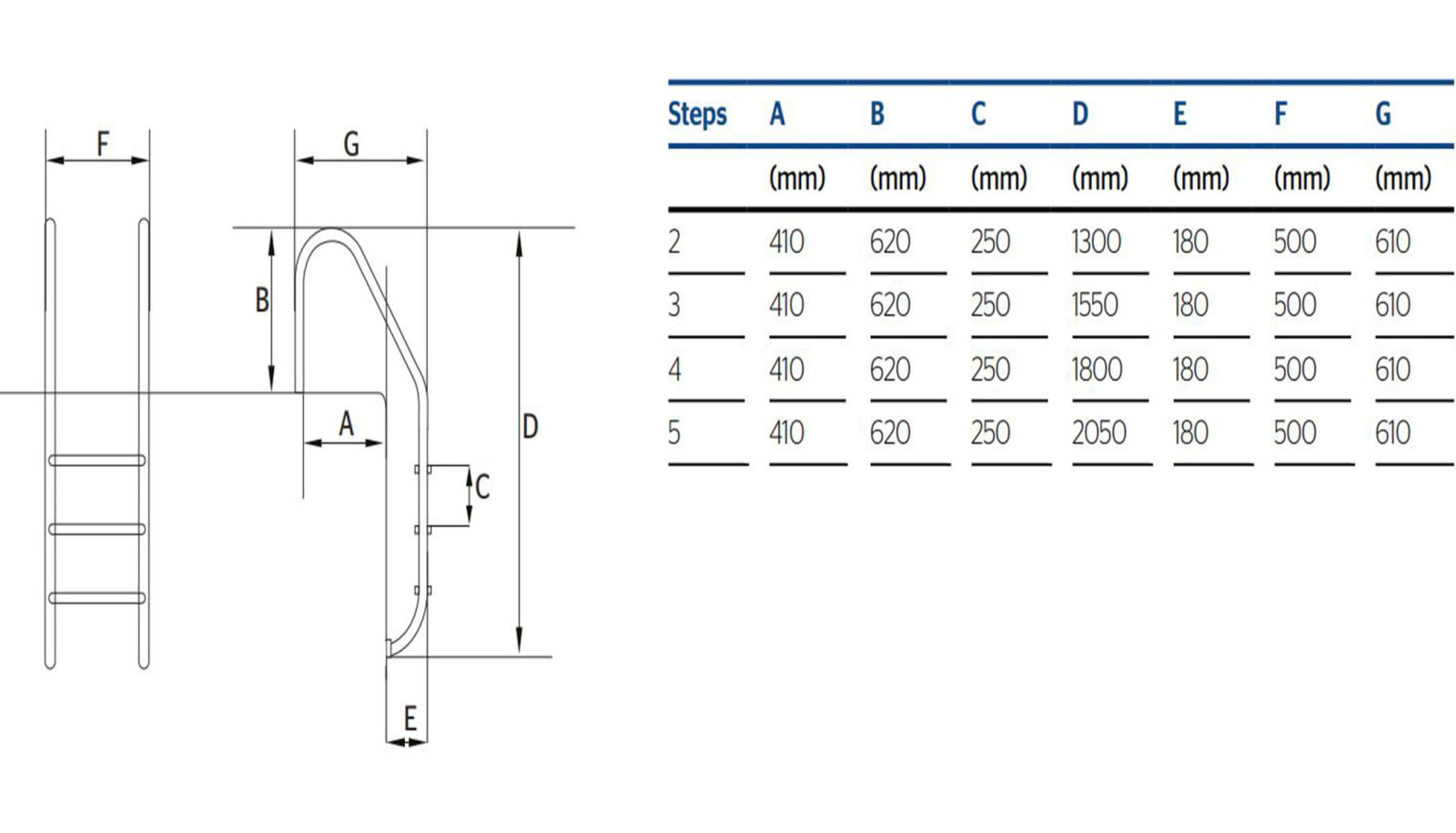 For inground pools, the AtecPool stainless steel ladder is made for submerged pools. Steps and handrails are composed of highly polished stainless steel. AISI 316L stainless steel is renowned for its extraordinary durability and corrosion resistance properties. Chromium, which makes up the majority of AISI 316L stainless steel, is essential for preserving corrosion resistance and strength when exposed to a variety of conditions.