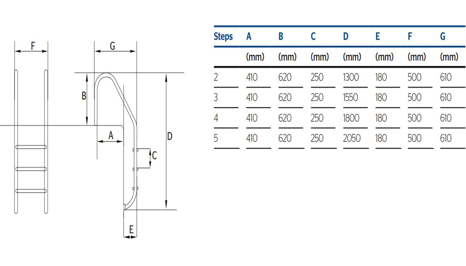 Brand: Atecpool,Voltage, V: 230/400,Power consumption, kW: 0.37 Category: AtecPool Standard stainless-steel ladder for inground pools, 5 steps, AISI-316