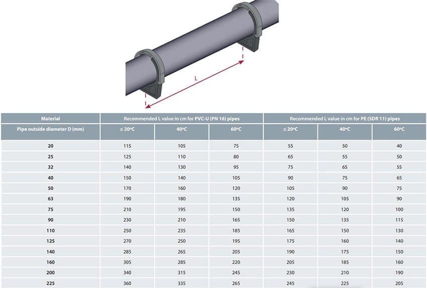 Use the recommendation of spacing the pipe clips, in accordance to several criteria – diameter, temperature of the transported liquid.