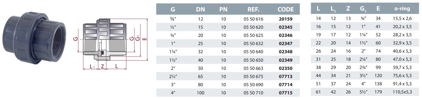 The main purpose of an PVC-U union is to connect pipes of the same diameter, maintaining the connection "half-temporary". Special ring allows separating the connection, of there is a need.