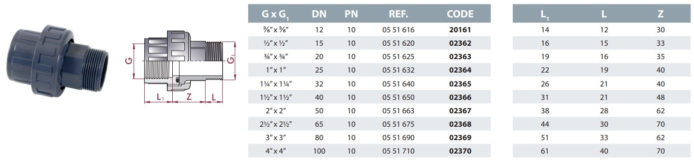 Type: PVC reducing couplings,Brand: Cepex ,Connection: 3/8 '' Category: Cepex PVC-U union with O-ring, male and female thread 1/2'' X 1/2''