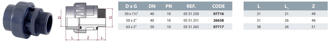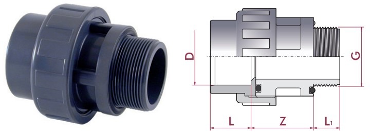 Brand: Aqua Industrial Group Category: Cepex PVC-U union with O-ring, male thread 63 mm x 2''