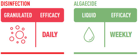 To maximise the effectiveness of the chlorine, the pH should always be adjusted before adding it to the water.Distribute the product dose uniformly across the pool's surface. The product addition should ideally take place at twilight, when there aren't any swimmers in the pool. An inexpensive chlorine and pH analyzer kit makes it simple to determine the free residual chlorine, which should always be between 0.5-2 mg/l. This check should be performed at least twice daily.