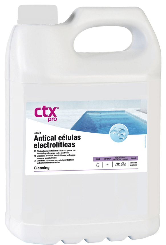Reduces electrochlorinator output and performance by removing limescale that builds up and adheres to electrodes. prolongs the life of the electrochorinator. Pool water passes past electrodes in electrochlorinators, a type of water disinfection device based on salt electrolysis, where chlorine is produced. Even electrodes with polarity change systems eventually develop calcareous incrustations, organic remnants, and mineral deposits on their surface, which reduce performance or cause equipment to break down. The electrodes must therefore be spotless for this reason. With this as its conclusion, Ctx-35 has been created. A ready-to-use acid cleanser specifically created to remove scale deposits without harming the electrodes is called DESCALER ELECTROLYTE CELLS. Each time the Sodium Hypochlorite is refilled, add the product directly to the dosing container containing the chlorine bleach. After adding, swirl the mixture to ensure homogeneity. The product doesn't need to be diluted before usage.