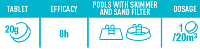 In a swimming pool no larger than 100 m3 (cloudy water), add 5 tablets of product. Maintenance treatment: Every week, add 2 tablets of product to swimming pools no larger than 100 m3.