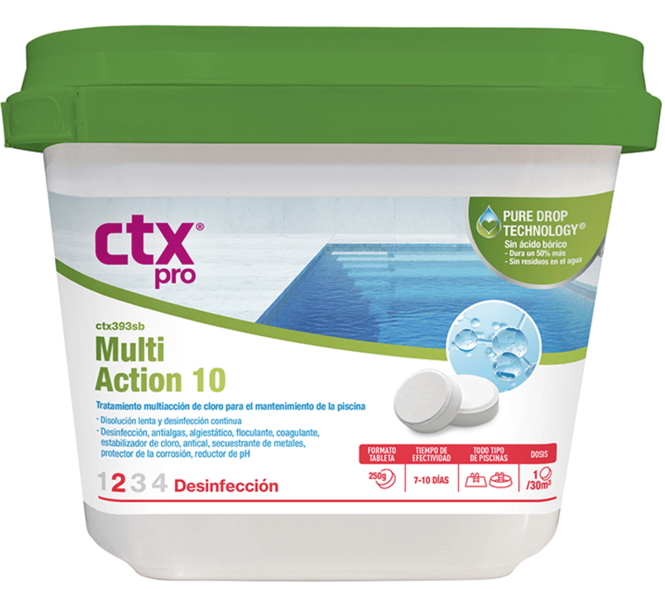 Chlorine type: Quick,Brand: CTX,Form: Powder/ granules Category: CTX 393SB Multiaction 10 boric free long lasting chlorine tablets for swimming pool, 4kg