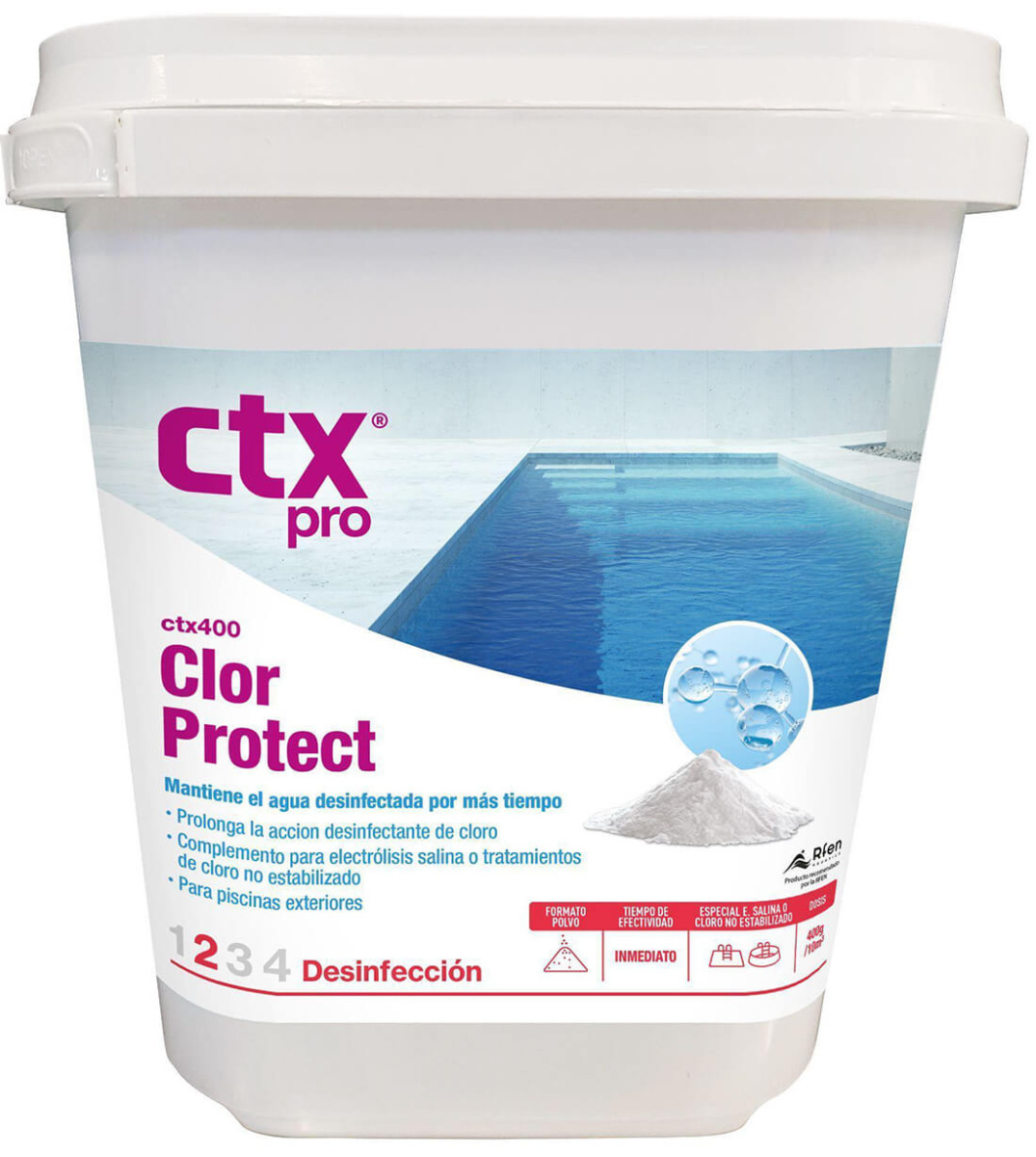 CTX 400 ClorProtect disinfection is a highly efficient and effective solution for swimming pool protection. Extends chlorine's disinfectant efficacy by reducing the quick deterioration caused by UV sunlight. For use in outdoor pools. Supplemental treatment for salt electrolysis or unstabilized chlorine. Fill the product into the skimmer or pump prefilter. It is an excellent disinfectant capable of killing bacteria, viruses, and other potentially hazardous microbes. The product's purpose is to keep swimming pool water clean, clear, and sanitary for the safety of all swimmers.