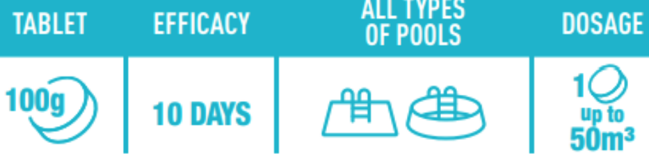 • Pools with a volume of 100 to 150 m3: 3 tablets of product every 10 days.