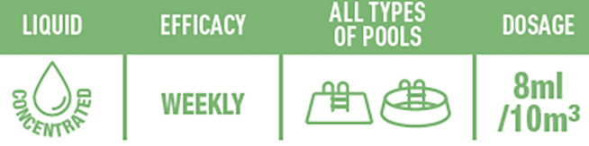 • Maintenance treatment: For every 50 m3 of water, add 40 ml of product once a week. These recommended doses can vary depending on the peculiarities of each swimming pool, weather circumstances, and so on.