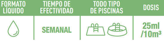 • Maintenance Treatment: Every week, add 0.25 litres of product per 100 m3 of water.
