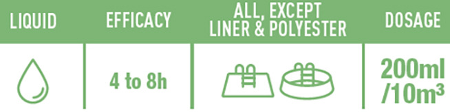 Depending on the type of algae and its proliferation, add 200 ml of product per 10 m3 of water.