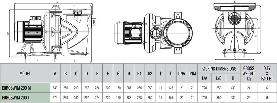 Brand: DAB,Voltage, V: 400,Power consumption, kW: 2.50,Flow rate, m3/h: 40 Category: DAB EUROSWIM 200T 31 m3/h pump for the swimming pool, 2 HP